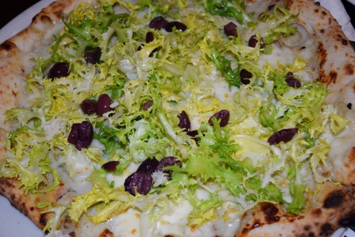 Pizza con blu di bufala, fior di latte, cipolla ramata di Montoro, scarola riccia, alici di Cetara e olive nere