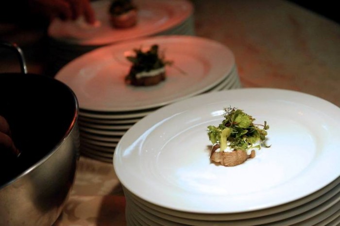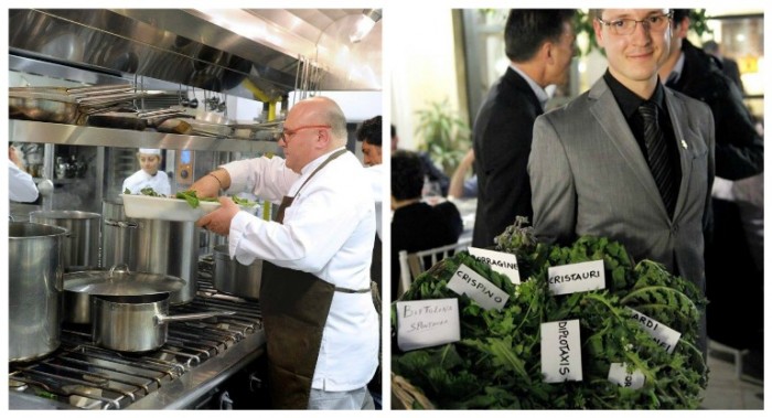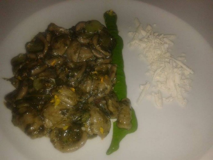 Dalla Puglia è arrivato l’infaticabile Pietro Zito della trattoria “Antichi Sapori” a Montegrosso di Andria, degnamente accompagnato da Antonio di Nunno de “Locanda di Nunno” a Canosa di Puglia. E qui sono di parte; ma tutti conosciamo quali sono i profumi della murgia ai piedi del Castel del Monte, e Pietro è riuscito a dare voce e forma a un territorio con le orecchiette di grano arso con cime di rape spontanee (amarette), aglio giovane e favette fresche, il tutto con ricotta leggermente stagionata.