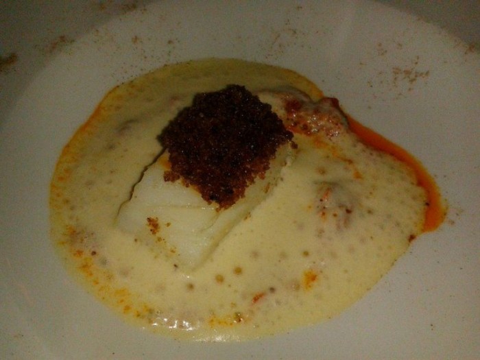 Licata si affaccia sul mare e negli anni sessanta/settanta era una ridente cittadina molto frequentata, qui Pino, ha saputo ridare lustro e speranza a un territorio a dir poco splendido, ancora intatto, sembra che il tempo si sia fermato a quel periodo florido. Il merluzzo aveva una delicata panure di olive, capperi e pane, cotto in modo magistrale senza fagli perdere consistenza e morbidezza e soprattutto sapidità. L’affumicatura era accennata e arricchiva di poco un complesso di sapori dati dall’emulsione di mozzarella e il coulis di pomodoro, che riportava il piatto nei canoni di acido morbido e piacevole equilibrio. I vini in abbinamento erano il Grillo dei Vigneti di Zabù, dal naso molto floreale e intriso di frutta bianca; Il Pipoli di Vigneti del Vulture da Greco e Fiano con profumi fini di erbe mediterranee, nocciola e camomilla fresca e infine La Falanghina di Vesevo segnata da mela e fiori bianchi.