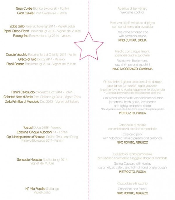 Dalla Campania Nino di Costanzo ci inebria con i profumi del suo risotto con cinque limoni, gamberi crudi e zucchine. Sembrava di passeggiare sulla costiera amalfitana e mangiare gamberi crudi sulla spiaggia; ottima la cottura e la mantecatura che danno risalto a un gusto equilibrato e fresco. In abbinamento d’amore, il Pecorino Casale Vecchi di Fantini riconoscibile dai profumi sinceri di agrumi e bella acidità al palato: mai abbinamento così azzeccato; a seguire il Greco di Tufo di Vesevo dove al palato emergeva una mandorla verde che metteva in risalto l’agrumato del risotto; per concludere il rosato Pipoli dei vigneti del Vulture a base Aglianico, per rafforzare la tesi che questo vitigno può regalarci rosati leggeri, profumati e abbinabile a piatti di mare ricchi di sapidità, i profumi di fiori e la freschezza del gusto erano la degna conclusione dell’ultima forchettata.