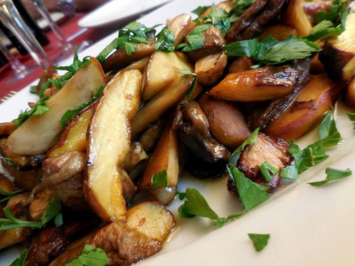Ma voi pensate che sia finito qui??? Naaaààà, e c’è il cuccio (per i non irpini , coniglio), sì quello nuscano … che fa le uova!!! :-) E ci pappiamo anche il Coniglio alla cacciatora che cinque minuti fa era ancora con la carota tra le zampe…e per contorno una padellata di Porcini al prezzemolo e all’aglio dell’Ufita, che quando siamo arrivati svolgevano la funzione di centrotavola!!!