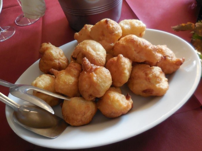 Si inizia dal benvenuto di Frittelline di baccalà accompagnate dal Greco di Tufo “Ergo sum” 2013 di Mier Vini che grazie alla spiccata acidità, svolge appieno la sua funzione ripulente sull’untuosità della preparazione.