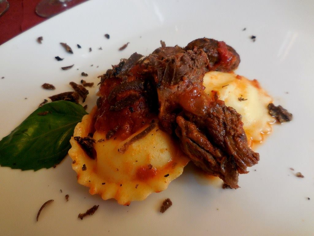 Manco a dirlo, abbiamo spazzolato tutto, accompagnandolo con un fruttatissimo e brioso Rosato “ Macchia Rosa” 2013 sempre di Mier Vini. E proseguiamo nel difficile: Ravioli di ricotta nuscana al ragù di cinghiale.