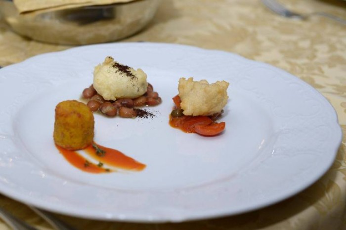 In apertura di cena fritti iniziali composti da fritto di baccalà in pastella con fagioli di Sarconi e polvere di caffè, pizza fritta con puttanesca di alici, crocchetta di patate con guanciale di maiale nero e coulis di pomodoro. Al calice lo spumante Extra Dry Assensi ottenuto da falanghina in purezza. Colore giallo paglierino delicato con riflessi verdolini. Al naso profumi di frutta, in particolare mela, e una bella freschezza al gusto.