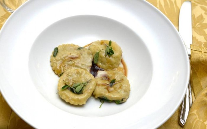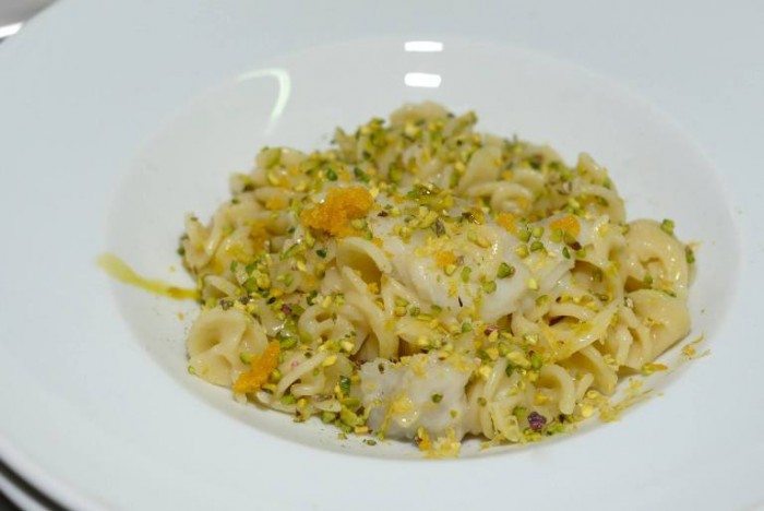 Due i primi preparati con la pasta artigianale trafilata in bronzo “Sant’Angelo” di Sant’Angelo Le Fratte prodotta con soli grani italiani (il prodotto rientra in un progetto più ampio da realizzarsi nel medio termine che prevede l’uso di soli grani lucani): fusilloni aglio e olio con baccalà, pistacchi e bottarga di muggine e ravioli di agnello e carciofi, topinambur e liquirizia abbinati rispettivamente con Basilicata igt rosato 2013 Retabli e Aglianico del Vulture doc 2011 Rotondo.
