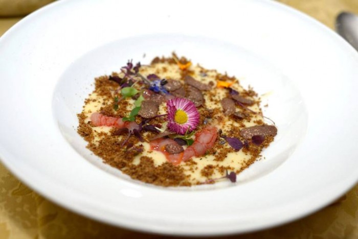Segue l’antipasto, zuppetta di patate e tartufo, porcini e crudo di gamberi rossi, abbinato a un grande fiano in purezza, Basilicata igt 2013 Biancorte, di colore giallo paglierino con riflessi verdi. Al naso si evidenziano note di frutta matura e vaniglia. Al palato leggeri sentori di mandorla amara tipici di questo vitigno. Piacevole freschezza.