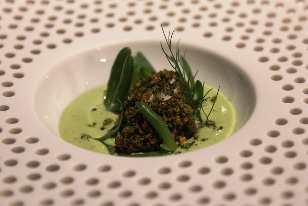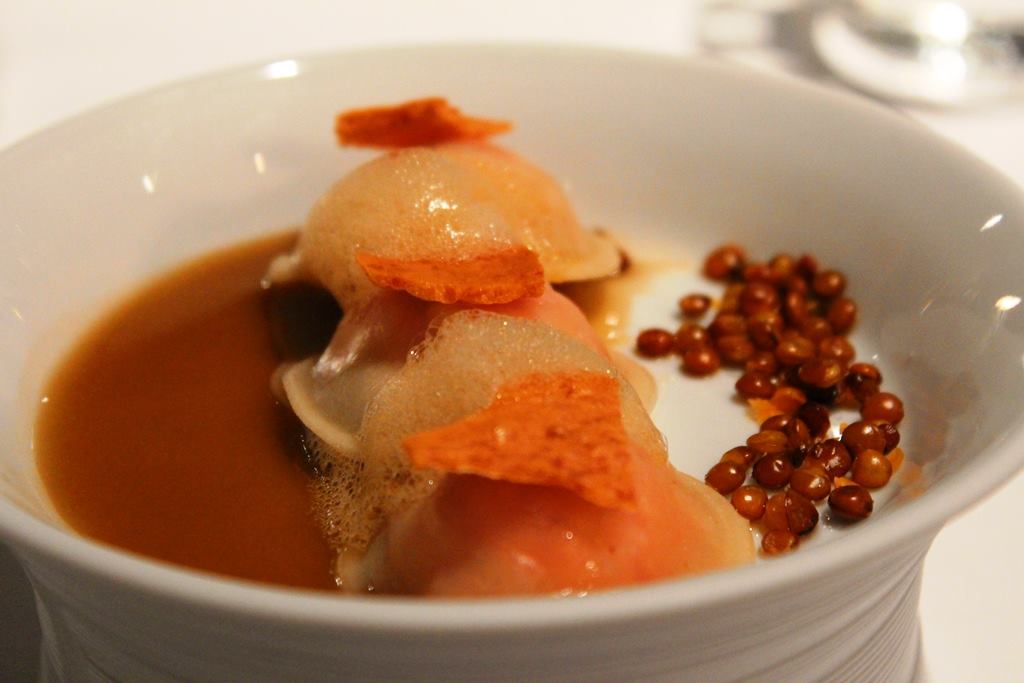 Osteria Francescana, L’Est incontra l’Ovest, tortelli cotti al vapore con gamberi e gelatina di cotechino, crema di lenticchie e lenticchie croccanti