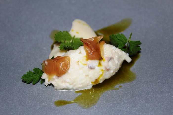 Su tutti l’esecuzione del baccalà alla brace con cavolo nero e patata e le linguine con cime di rapa, vongole e succo di canocchia, danno lo spessore e l’intelligenza di questo cuoco nell’approcciare due ingredienti come il baccalà e la pasta secca in una versione contemporanea.