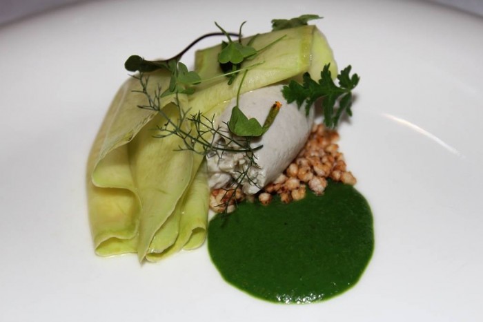 Osteria del Povero Diavolo, gelato di alici marinate purea di rosole e sorgo soffiato, zucchine ed erbe aromatiche