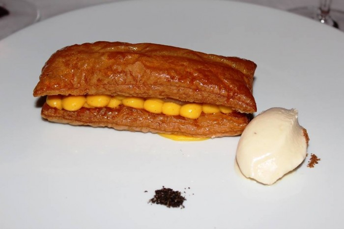 Anche la chiusura è lontana dalle banalità, millefoglie, mela cotogna e cardamomo, gelato all’aceto. In questo dolce Pier Giorgio dimostra di essere un essere in grado di realizzare un millefoglie a regola d’arte, ma di usare anche l’acidità per sgrassare e non appesantire.