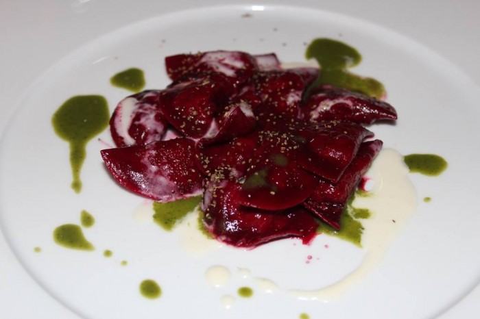 Osteria del Povero Diavolo, raviolo di rapa rossa con ripieno di faraona, ristretto di Parmigiano, succo di levistico e semi di sedano