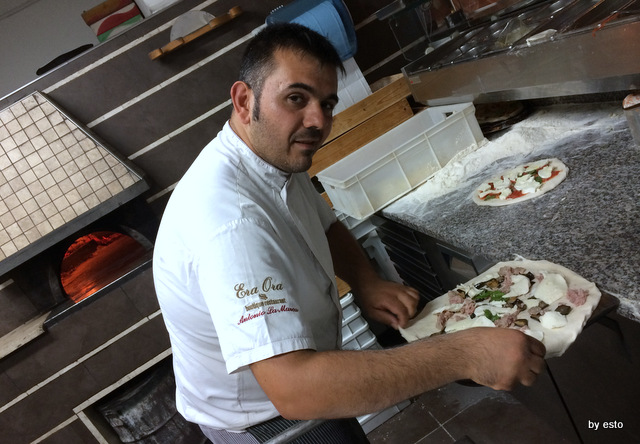 E il pizzaiuolo gli faceva sponda applicandosi nell’impastare, stagliare e stendere la pizza.