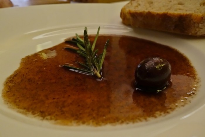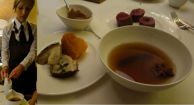 Capriolo cotto in brodo speziato, zucca e purea di castagne. Il brodo viene versato al momento su un ramoscello di pepe fresco e un fiore d’anice. Il sapore è di rara intensità, e ben si sposa col capriolo, che gioiosamente prima “pucciamo” nel brodo, poi ricopriamo con zucca e castagne.