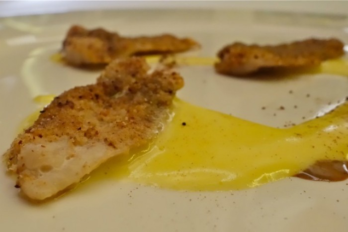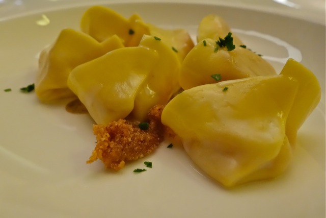 Tortelli di mela cotogna e acciuga profumati agli amaretti sbriciolati. L’animo del piatto è appagante, col gioco tra mela e acciuga, corroborato dall’amaretto. Tuttavia, man mano che acciuga ed amaretto vengono esauriti, registriamo qualche eccesso di dolcezza.