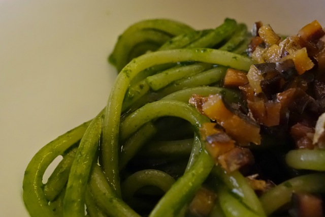 Spaghetti verdi, anice e missoltino. Spesso si legge che la cucina di Lopriore è ermetica e complessa, non per tutti. Per apprezzare questo spaghetto freddo e d’ispirazione orientale è necessario buttare il cuore oltre l’ostacolo. Fatto questo, la soddisfazione è molta.