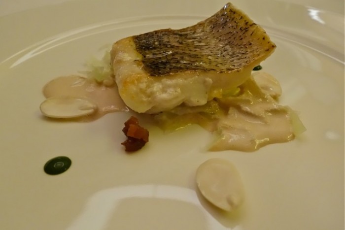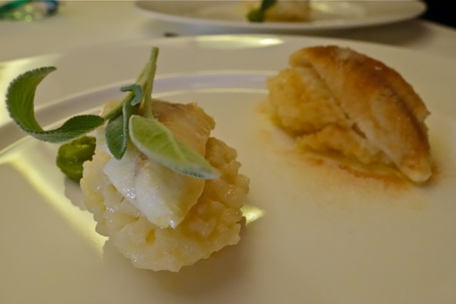 “Il classico che vorreste sempre trovare: riso in cagnoni al pesce persico”. Rivisitazione prevalentemente visiva del classico risotto al pesce persico. Qualche eccesso nel burro mina la godibilità di questa portata.