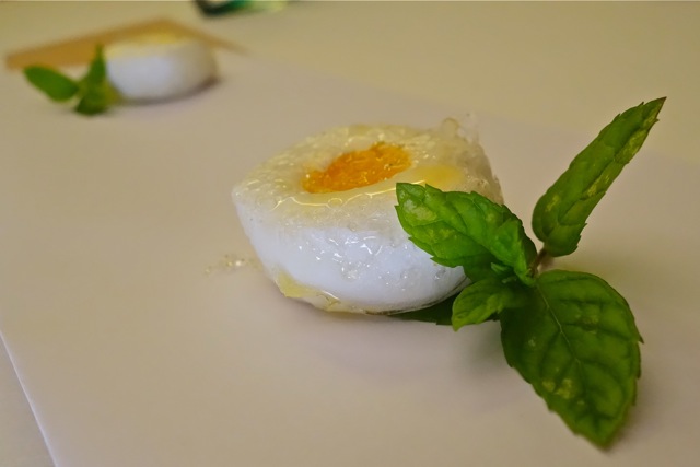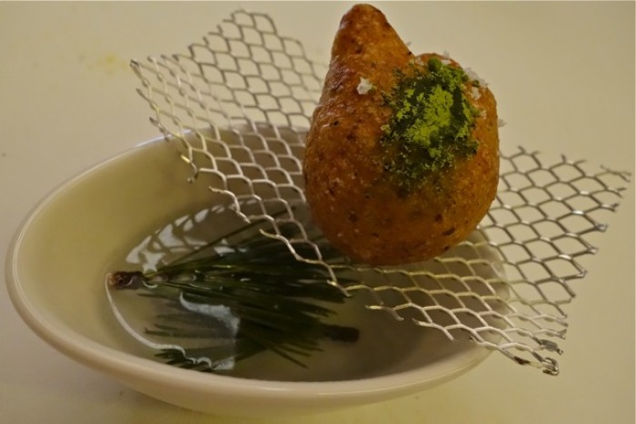Sciatt. Piatto tipico della tradizione valtellinese approfondito con polvere di Macha, servito su un balsamico di pino. Quest’ultimo apre le vie respiratorie accentuando la nostra sensibilità ai profumi per l’intera cena.