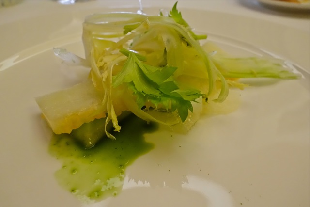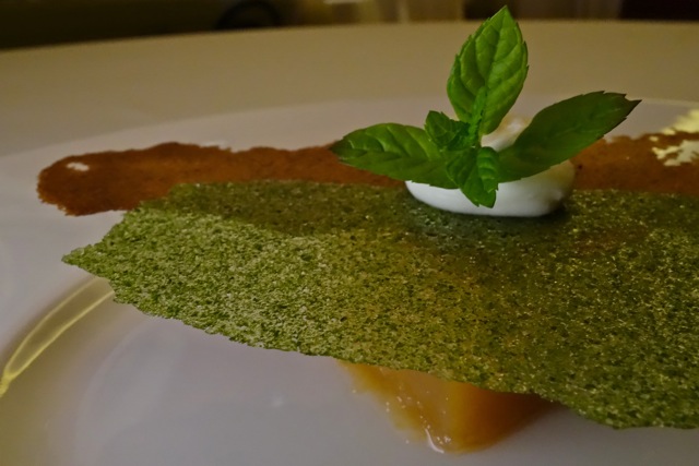 Torta millefette di mela profumata alla cannella e lattuga di mare. Con la lattuga si inizia e si colclude. Un dessert leggero e godibile, che manca però di un po’ di ispirazione sul comparto dolce, per quanto il lato più sapido sia ben soddisfatto dalla cialda di lattuga.