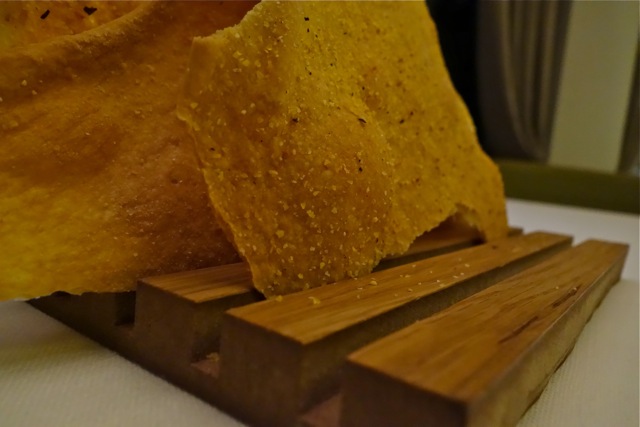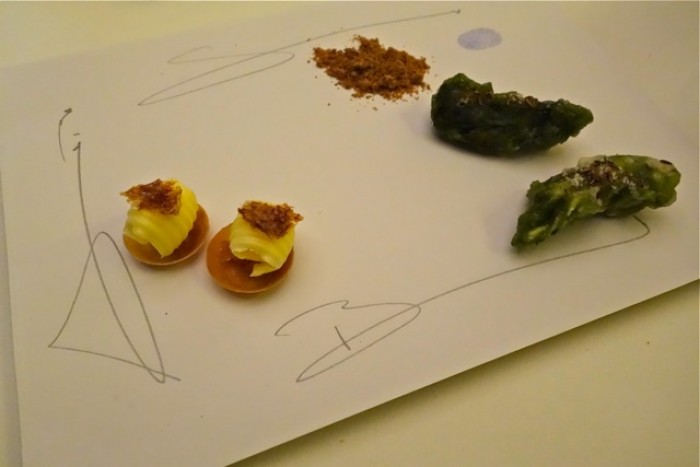 Forme. Ovvero Semi di Zucca in polvere; Tartelletta burro salato, bottarga di lavarello e pompelmo; involtino di lattuga di mare, agrumi canditi, nocciola e cumino. Lo chef scrive a mano libera sulla sua “tavolozza d’artista”. L’involtino è uno straordinario gioco agro-dolce, col cumino che gli dona un’imperscrutabile profondità.
