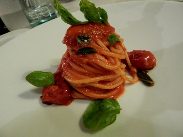 A seguire “ il must” dedicato a Raffaele Vitale, “Spaghetti al pomodoro con pacchetelle Danicoop “…E’ il piatto con cui si misura un cuoco!!! Bellissima esecuzione, ottima materia prima, La scelta di metterlo in carta, chiaramente ispirata da una “vis provocatoria” del pensiero “ balzaniano” tutto condensato nel motto…buttiamo via i sifoni e facciamo parlare il susseguirsi delle stagioni!!! Delicatissimi, ma al tempo stesso dal sapore condensato i “Ravioli ripieni di brasato di cinghiale e conditi con colatura di alici di Cetara”. L’idea è quella di unire due elementi selvatici (non allevati) contrapposti, ma anche mare e terra!!! La spruzzatina supplementare di colatura è un bonus che vi consiglio di concedervi…per pareggiare il conto con il brasato di cinghiale. “ Rigatoni di rinforzo di baccalà ” E’ un piatto della memoria, ci ricorda, ovviamente, l’insalata di rinforzo natalizia. Con cavolfiori, baccalà, salsa di peperoni all’aceto e olive. Bella la sistemazione del piatto, goduriosa la degustazione, proverei a servire il piatto…freddo!!!