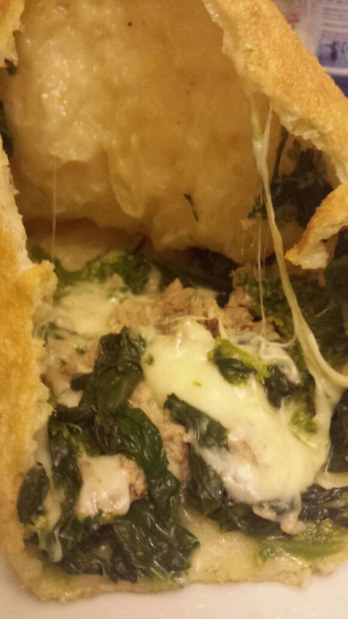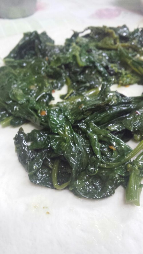 Stendere i panetti di pasta con le mani fino a formare un disco. Adagiare il ripieno su una metà del disco: friarielli, qualche rondella di salsiccia, la provola a tocchetti.