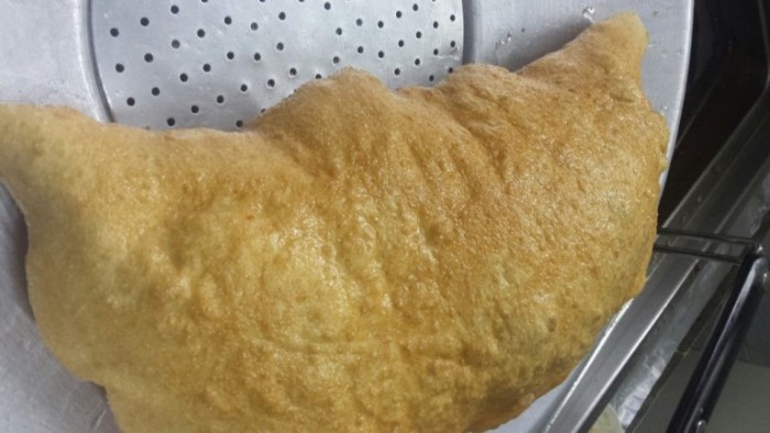 Quando la pizza risulterà dorata toglierla dall’olio e adagiarla su carta assorbente. Servire bollente.