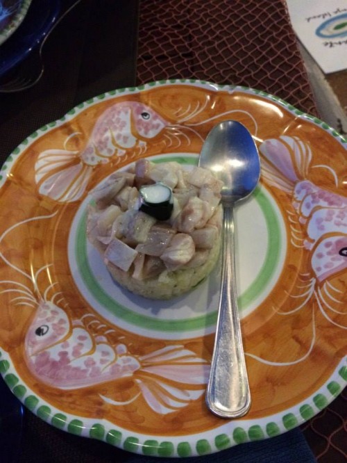 Ed invece ecco la sorpresa: l’Oresteria. Faccio una passeggiata serale sul corso principale e mi ritrovo davanti ad un posto molto carino, con tavolini all’aperto colorati ed originali e vista sul porto, che offre una scelta di antipasti molto sfiziosi, accompagnati da un calice di vino. Faccio scegliere ai ragazzi che mi portano un assaggio di tutti gli antipasti: Tracina reale marinata su riso freddo al cacio e pepe, Crocchette di calamaro con peperoni in agrodolce, Polpette di Pesce al pomodoro, Barracuda marinato con olio al peperoncino, Trito di Merluzzo marinato con schiacciata di patate, Cous Cous con verdure in padella e polpo, Insalata di Polpo con patate e rucola. Le preparazioni sono inappuntabili e le materie prime di prima scelta. L’originalità è di casa, sia nella scelta del tipo di locale informale, giovanile e disimpegnato, sia in cucina, dove il titolare Oreste Romagnolo osa con successo, proponendo combinazioni ed accostamenti inediti, a prezzi economici.