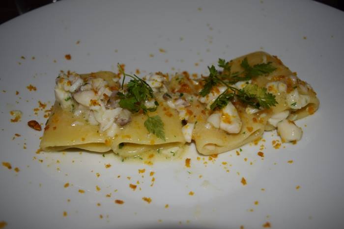 Il primo piatto non poteva che essere della chef di casa, che cala l’asso con i paccheri del Pastificio Gentile con pescato del giorno e bottarga di muggine.