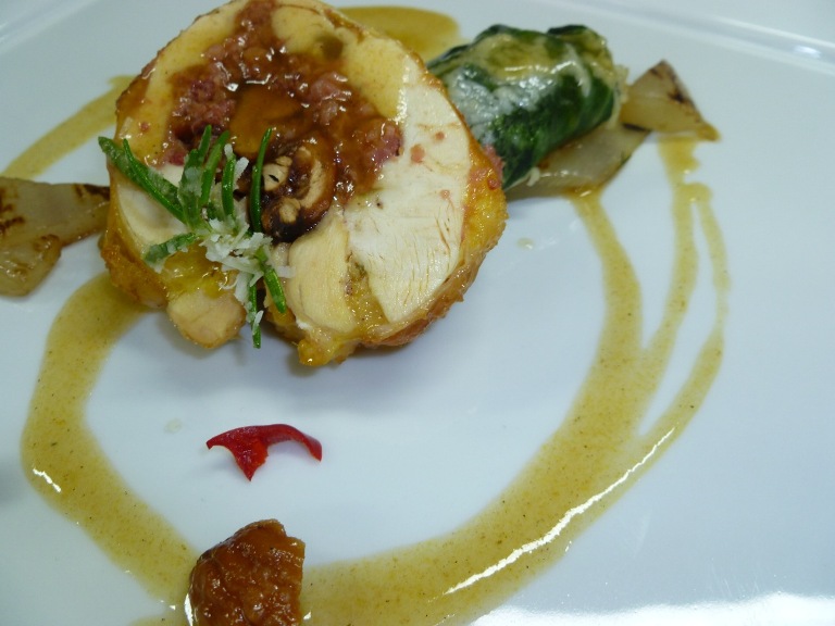 tagliare il cappone, servirlo con l’involtino di bietola, con le coste fare una insalatina e condirla all’agro.