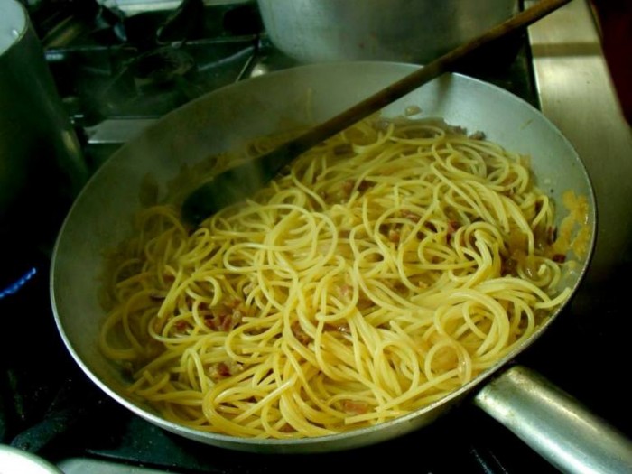 Le temperature sono importantissime, mai al di sopra dei 70°, per questo il formaggio e le uova si aggiungono a crudo al di fuori della fiamma, affidandosi così, solo all’olio di gomito per mantecare bene il tutto.