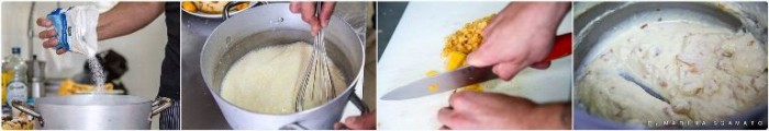 In una casseruola, si mette lo zucchero, la farina, la vanillina e un pizzico di sale, mescolandoli tra loro. Gradualmente, s’aggiungono le uova, intervallandole con l’acqua e il latte. Una volta ottenuto un composto liquido lo si mette sul fuoco. A fiamma media, si continua a mescolare. Sarà pronta quando alzando il mestolo, la crema non scivolerà da questo. Una volta cotta, si grattugia la scorza di un limone non trattato e la si lascia raffreddare.