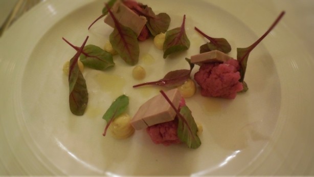 Battuta di Chianina al coltello con foie gras e maionese. Piatto d’arte in tempera viva. Da assaggiare sfiorando i colori e facendoli toccare fra loro. I tre insieme sanno il fatto loro.
