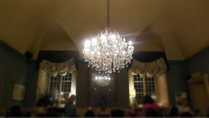 Maìtre di sala ci accompagna. Pianoforte in sottofondo.