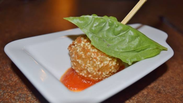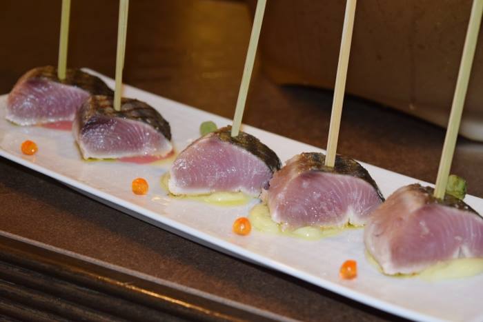 Il benvenuto è stato dato con una polpetta di melanzane su salsa di pomodoro e basilico, gambero crudo con centrifuga di mela verde, la palamita su salsa di rapa e salsa di avocado e la zeppolina di ricotta.