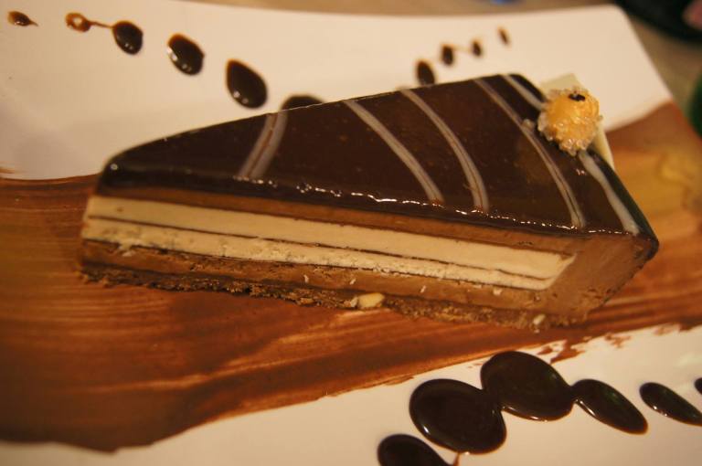 A concludere, un capolavoro di alta pasticceria, la torta Cinque Sensi di Sal de Riso con croccante, bavarese e mousse di nocciole di Giffoni ricoperta con glassa di cioccolato fondente e decorata con glassa di cioccolato bianco e nocciole pralinate con limone di Amalfi.