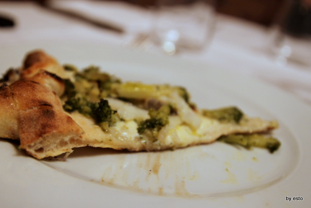 Il trancio di pizza con cime di rapa e ventresca di baccalà per benvenuto.