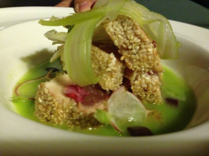 Scintilla, palamita panata con il sesamo bianco su gazpacho verde 9/8/2014 Torna a: Scintilla dell’Hotel Cocumella, alta cucina nell’albergo più antico di Sorrento Scintilla, palamita panata con il sesamo bianco su gazpacho verde← PrecedenteSuccessiva →
