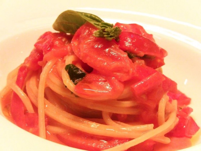 Prepariamo gli ingredienti di base iniziando a tagliare a quattro i nostri pomodorini, a seguire cipolla ed aglio. Successivamente ricaviamo il Latte di Bufala dalla spremitura della Mozzarella di Bufala. Fatto ciò, prepariamo il sughetto di pomodorini con una base di soffritto di cipolla ed aglio. Lasciamo cuocere i pomodorini per 4-5 min. aggiungendo del basilico fresco tagliato con le mani. Versiamo gli spaghetti nella padella con i pomodorini a cottura al dente, in modo tale che finalizziamo la cottura in essa come se fosse un risotto. Una volta arrivati a cottura, amalgamiamo il tutto con del latte di mozzarella di bufala a fuoco spento.