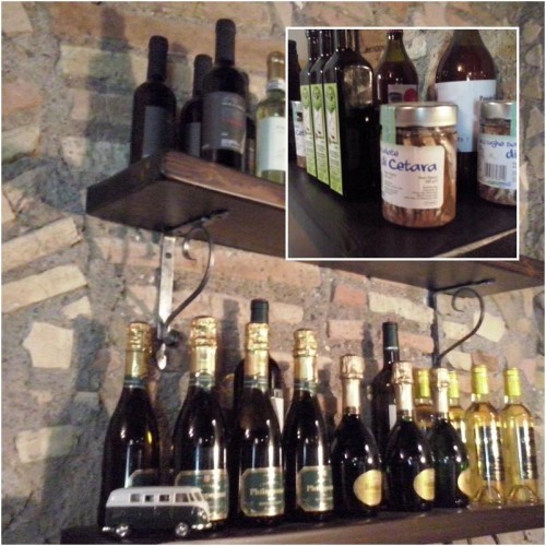 Pochi fronzoli ed elementi decorativi. Sulle mensole tra i vari prodotti che si possono acquistare, troviamo: vini, champagne e birre artigianali, olii, pomodoro e alici di Cetara.