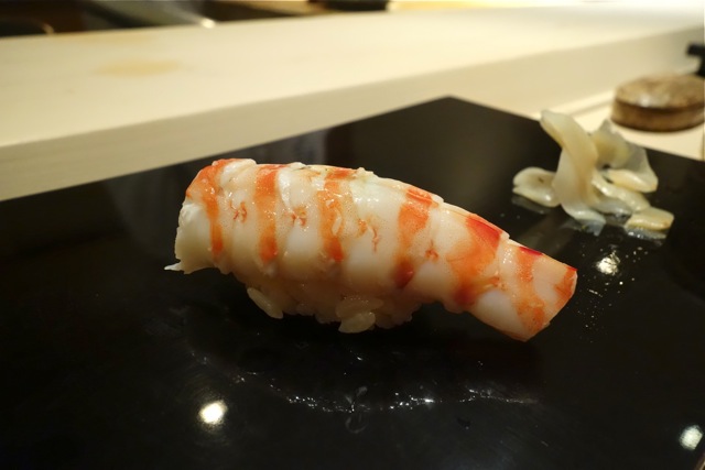 Ecco il Kuruma Ebi. Piuttosto dolce, tiepido. Dopo le esperienze di sushi Italiane, dove viene servito freddo e gommoso, mi si apre un universo.