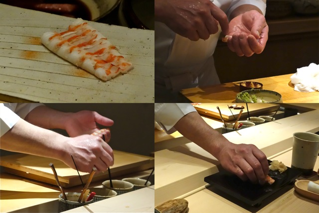 Kuruma Ebi, la preparazione. Prima viene pulito, passato col wasabi, adagiato sul riso tiepido, e poi cosparso o di soya o di aqua e sale. Questa, fondamentalmente, la preparazione di ogni assaggio. Acidità e sapidità sono i due protagonisti della vera cucina Sushi, e di buona parte di quella giapponese.