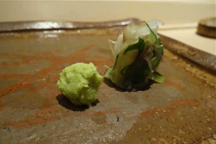 Wasabi e zenzero, entrambi preparati freschi, unici ingredienti lasciati a nostra discrezione. Il primo, per esaltare i sapori, il secondo, per pulirsi la bocca tra i vari assaggi.