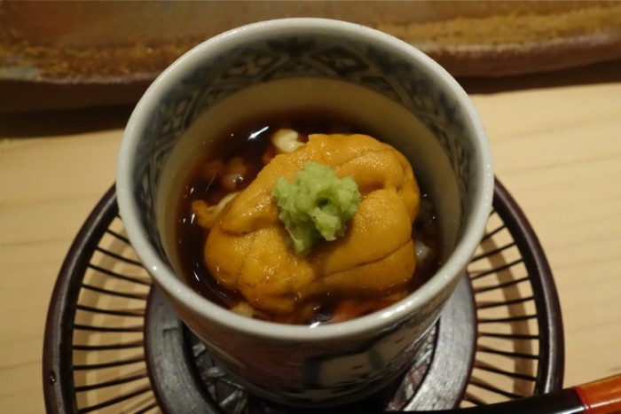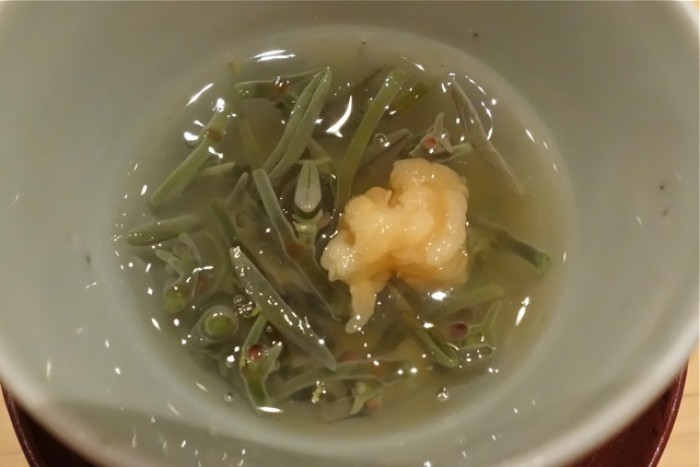 Zuppa fredda di soia, riccio e wasabi. Delicatissima.