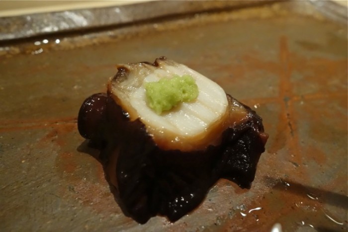 Abalone, con la salsa del suo fegato. Quest’ultima, viene poi mischiata al riso, per qualche boccone di rara gratificazione.