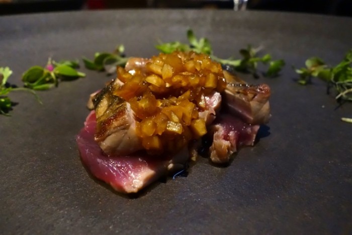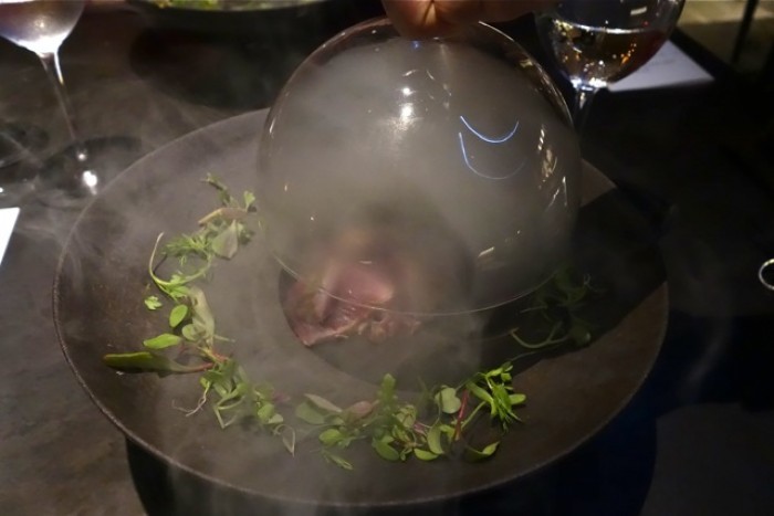 Ayu in Clear Stream: servito con la sua bile, fermentata e sferificata, crema di piselli e zucchine. I piccoli Ayu (pregiato pesce giapponese) vengono prima portati vivi in tavola, in una bacinella, poi fritti e serviti. Portata di gusto troppo giapponese: nei sapori, amarissimi; negli ingredienti, come la bile; e nel concetto, quello di mostrare a tutti i costi il prodotto ancora vivo. Unico eccesso della serata.