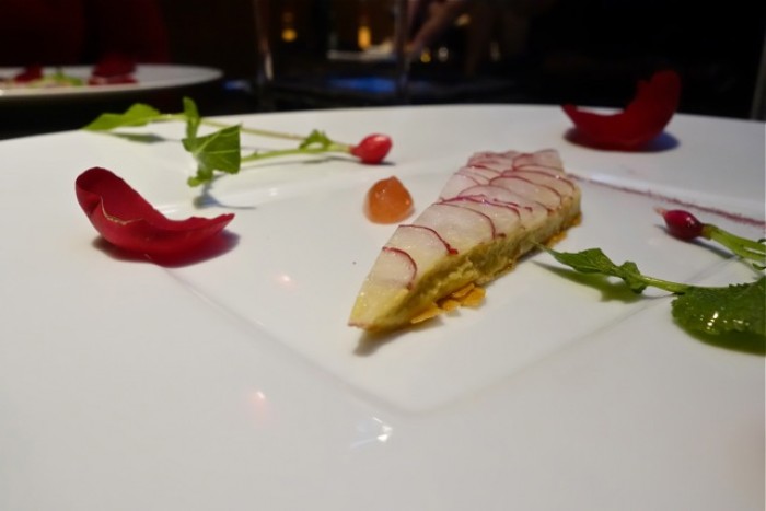 Koi Nobori. Ogni 5 Maggio, in Giappone, si celebra la festa dei bambini, in cui delle bandiere a forma di carpa vengono fatte sventolare all’aria. Takazawa riprende questa tradizione, proponendo una portata che ricorda le scaglie del sacro pesce nell’aspetto, a base di ravanelli, cialda dolce e foie gras. Gusto molto Francese, per una portata d’ispirazione Giapponese.