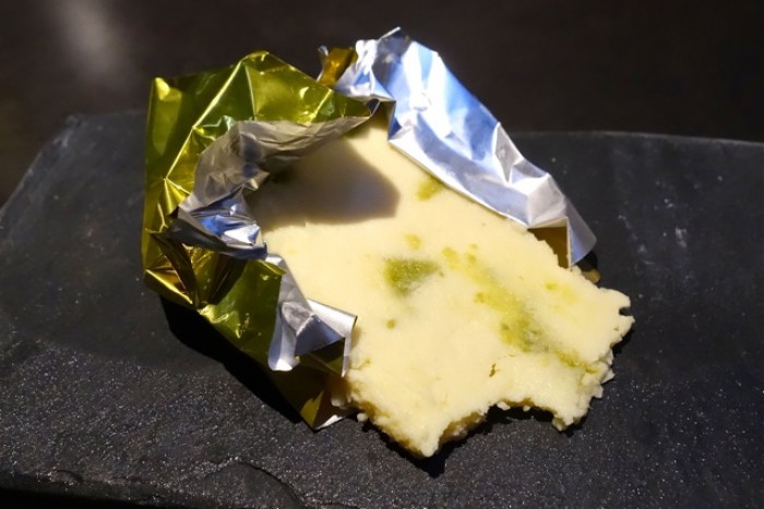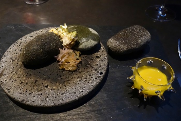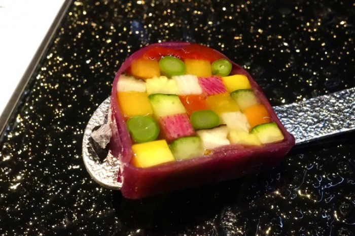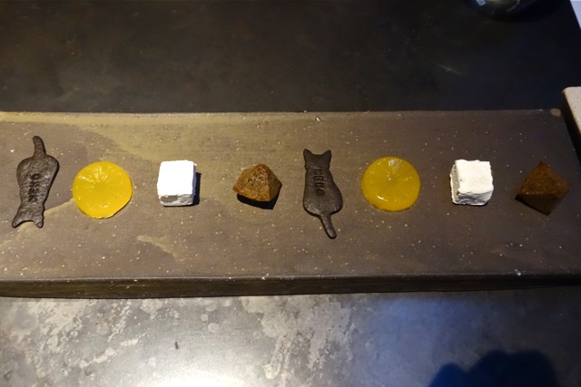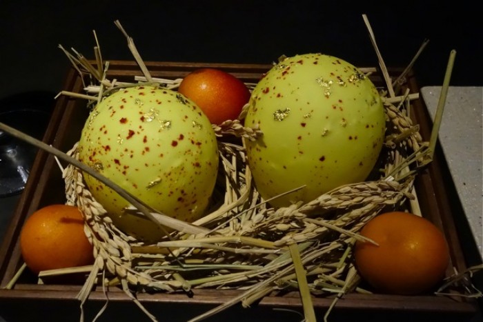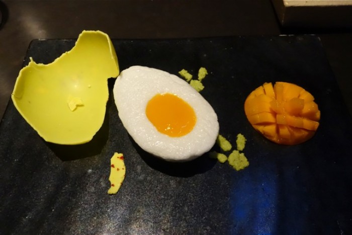 Mise en place, stupenda. Il guscio è di cioccolato, l’interno di bianco d’uovo e mango, le impronte di wazabi. Il mango proviene dalla provincia di Myazaki, omonima col celeberrimo fondatore dello studio Ghibli. Divertente e di fruttata dolcezza, senza eccessi.