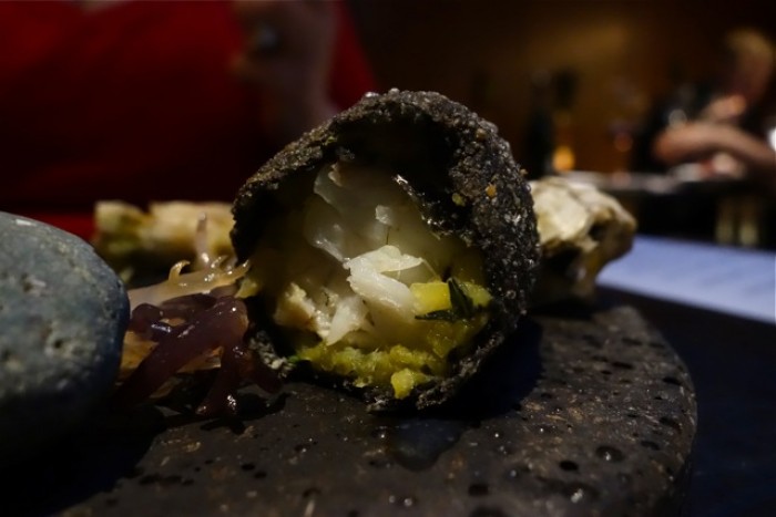 Eccola, ripiena di granchio e patata dolce. Da abbinare ad una crema di zafferano, contenuta in un riccio di mare in vetro. Ancora, rara delicatezza.