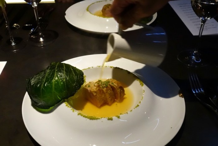 Ecco lo chef all’opera, in silenzio, sul suo palco, al centro della sala. Più che un piano cottura, ci troviamo davanti al laboratorio di un alchimista. I gesti sono lievi, gli ingredienti vengono misurati col contagocce.