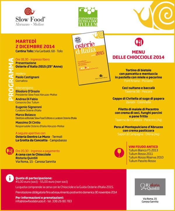 Tollo, 2 dicembre. Presentazione Osterie d’Italia 2015 a Cantina Tollo 22/11/2014 1.8 MILA LETTURE Presentazione Osterie d’Italia 2015 a Cantina Tollo